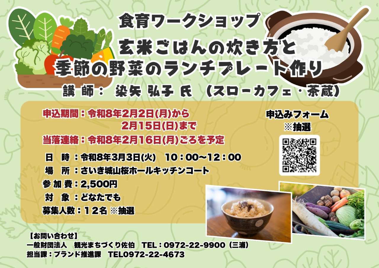 【2026年3月3日(火曜日)】 令和7年度食育ワークショップ 参加者募集「玄米ごはんの炊き方と季節のランチプレート作り」
