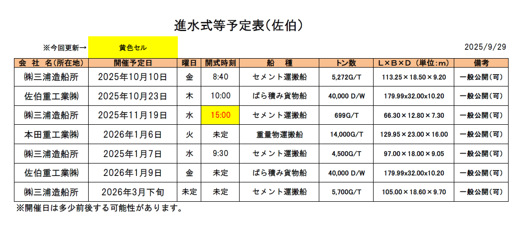 - 進水式に関しては表掲載の通りの予定ですが、急な変更の可能性もございますこと、