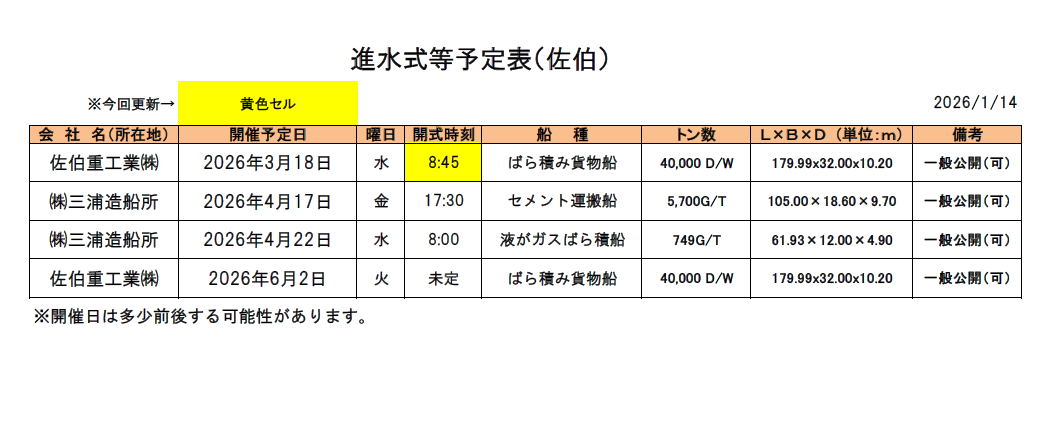 進水式予定(2026年1月14日現在)
