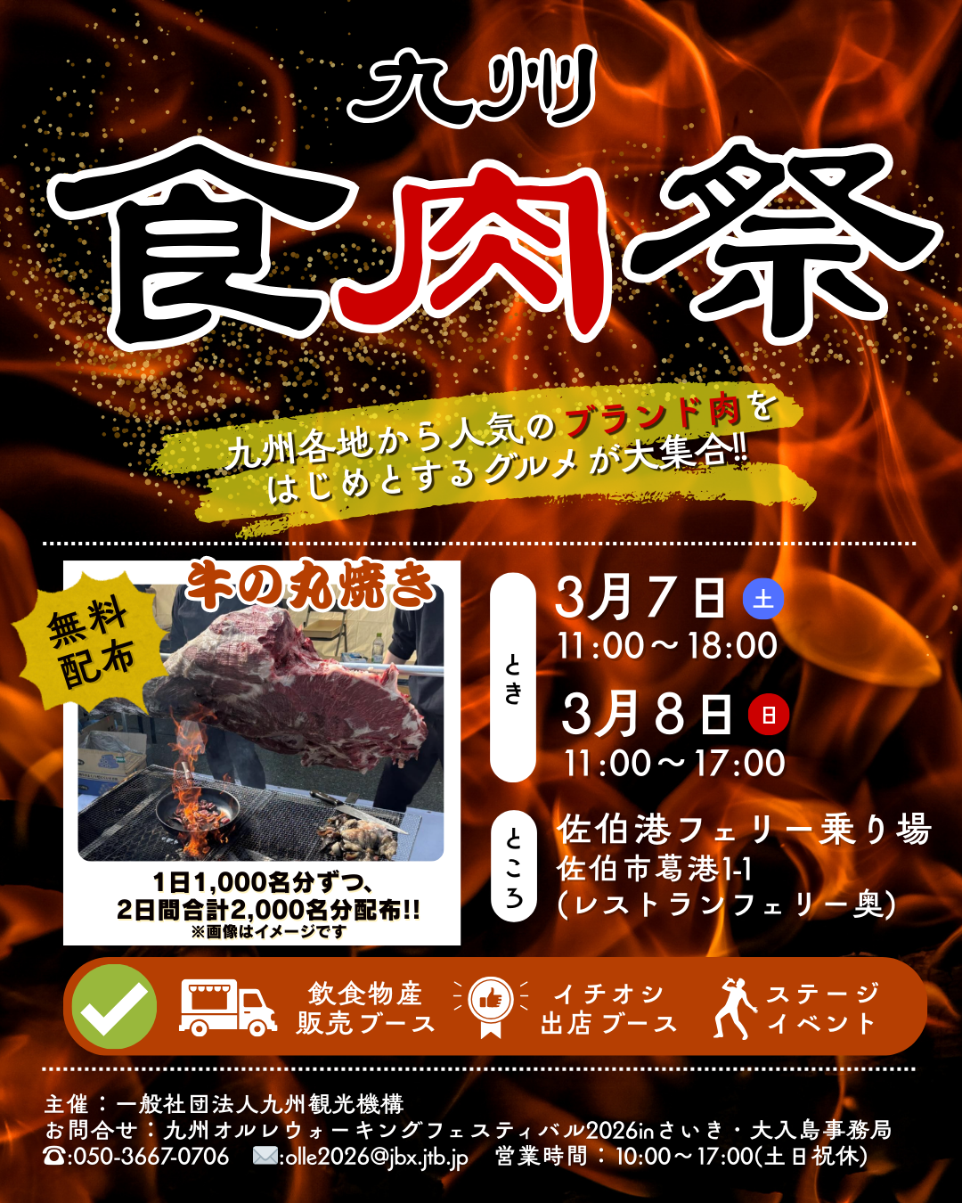 3月7日(土)・8日(日)の2日間、佐伯港フェリー乗り場にて「九州食肉祭」を開催いたします。