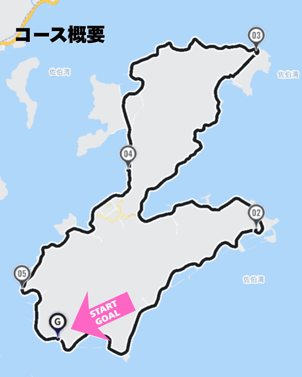 大入島フェリー大入島営業所前(石間地区)を発着点とし、左回りで県道691号および692号を一周する約17kmのコースです。