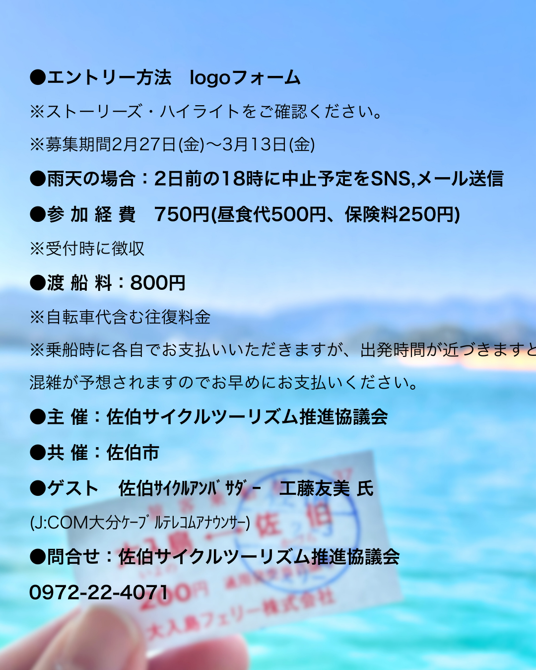 * 終了後、14時大入島発フェリーで佐伯港へ帰港します